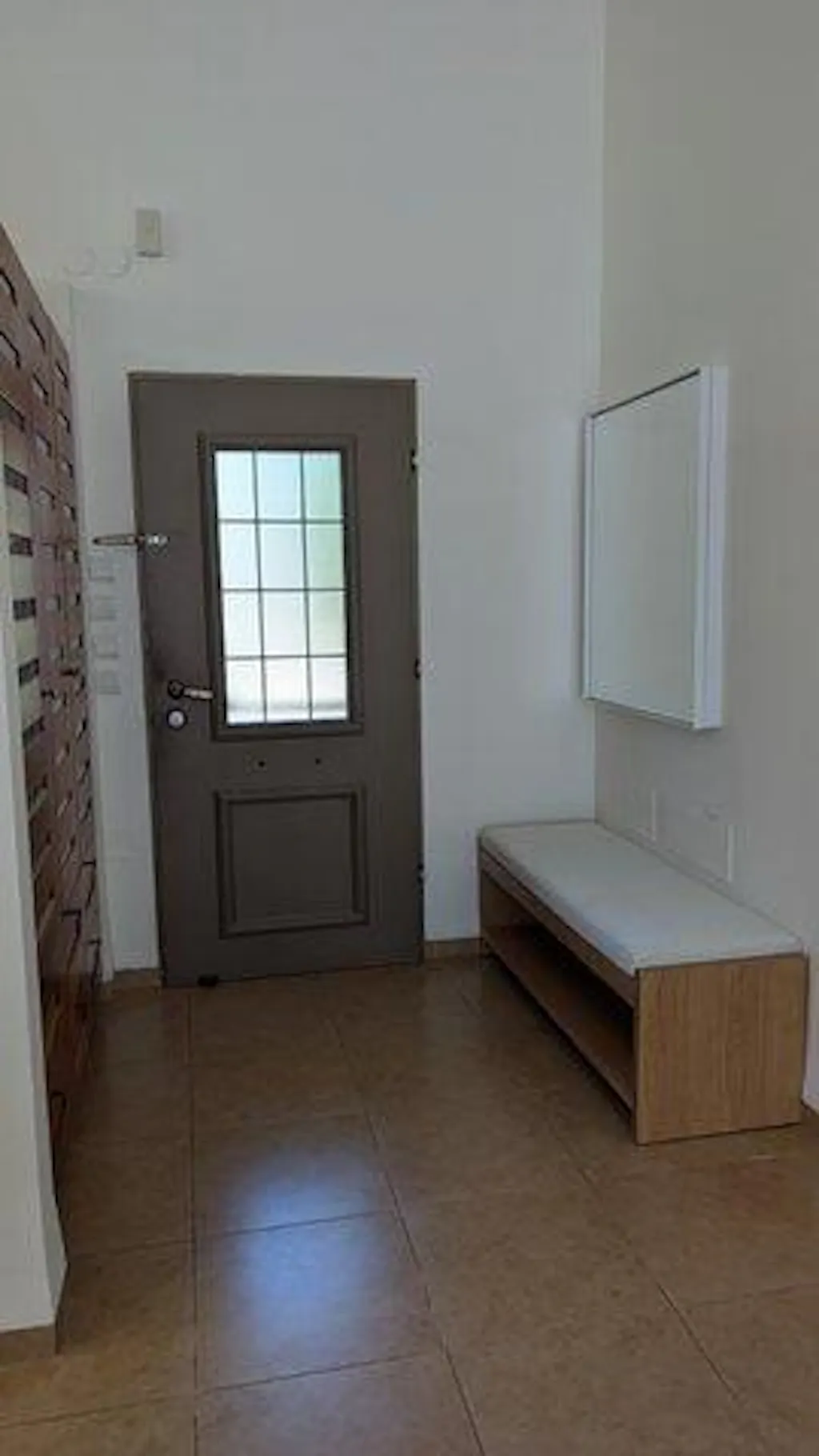 ספסל לכניסה לבית עם מדף פתוח וריפוד בהיר